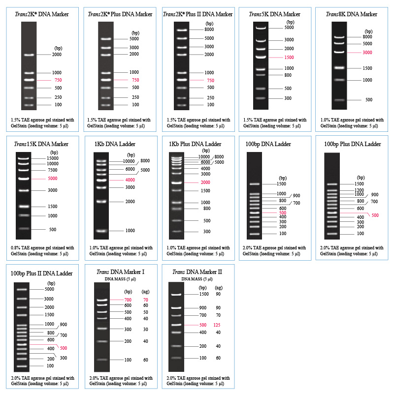 Trans DNA Marker 均采用國際先進(jìn)的生產(chǎn)工藝—酶切質(zhì)粒DNA,所得到的DNA Marker不僅背景干凈、帶型漂亮,且DNA分子量的準(zhǔn)確性、電泳帶型和產(chǎn)品的穩(wěn)定性遠(yuǎn)遠(yuǎn)高于PCR產(chǎn)物混合而成的DNA Marker。所有DNA Marker系列產(chǎn)品均為即用型產(chǎn)品,已含有適宜濃度的上樣緩沖液,可直接電泳,使用方便。4℃保存個(gè)月,-20℃保存兩年。不建議用于聚丙烯酰胺凝膠電泳。
