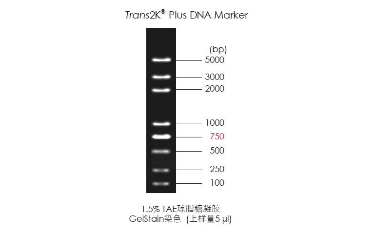Trans2K?Plus DNA Marker由8條線狀雙鏈DNA條帶組成,適用于瓊脂糖凝膠電泳中DNA條帶的分析,不建議用于聚丙烯酰胺凝膠電泳。本產(chǎn)品為即用型產(chǎn)品,已含有1×Loading Buffer,直接取5 μl電泳,使用方便,電泳圖像清晰。其中750 bp條帶濃度為100 ng/5 μl ,顯示亮帶,其余條帶濃度均為50 ng/5 μl。便于準確判斷目的產(chǎn)物DNA的量。