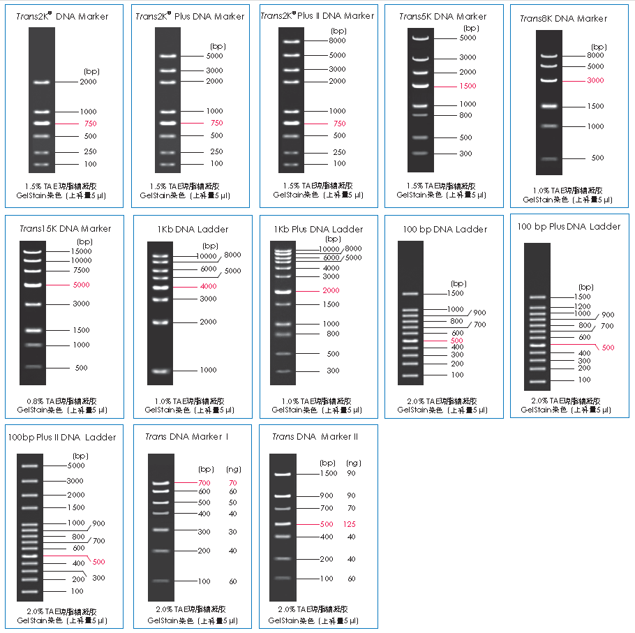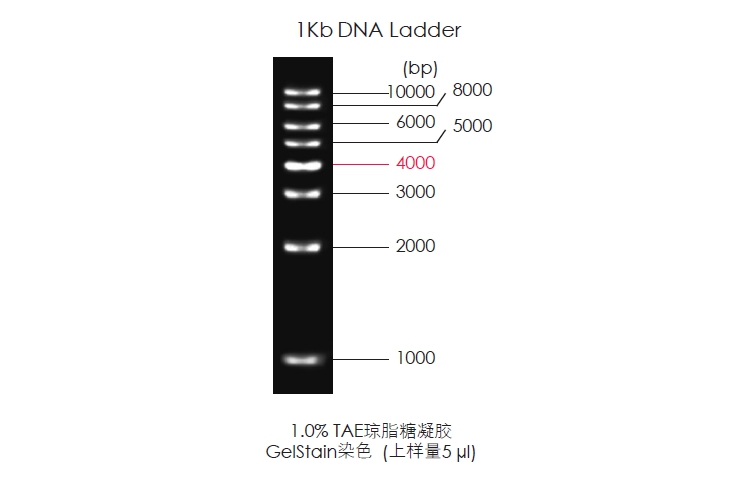 1 Kb DNA Ladder是由8條線(xiàn)狀雙鏈DNA條帶組成,適用于瓊脂糖凝膠電泳中DNA條帶的分析,不建議用于聚丙烯酰胺凝膠電泳。本產(chǎn)品為即用型產(chǎn)品,已含有1×Loading Buffer,可根據(jù)實(shí)驗(yàn)需要,直接取5 μl電泳,使用方便,電泳圖像清晰。其中4000 bp條帶為100 ng/5 μl,顯示亮帶,其余條帶濃度為50 ng/5 μl。