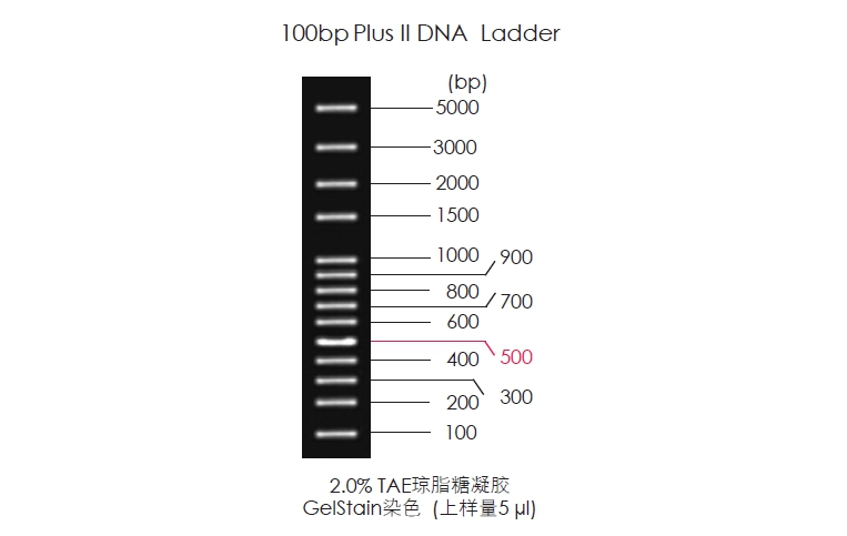 100 bp Plus II DNA Ladder是由14條線狀雙鏈DNA條帶組成,適用于瓊脂糖凝膠電泳中DNA條帶的分析。本產(chǎn)品為即用 型產(chǎn)品,已含有1×Loading Buffer,可根據(jù)實(shí)驗(yàn)需要,直接取5 μl電泳,使用方便,電泳圖像清晰。其中500 bp條帶 濃度為100 ng/5 μl,顯示亮帶,其余條帶濃度均為50 ng/5 μl。便于準(zhǔn)確判斷目的產(chǎn)物DNA的量。