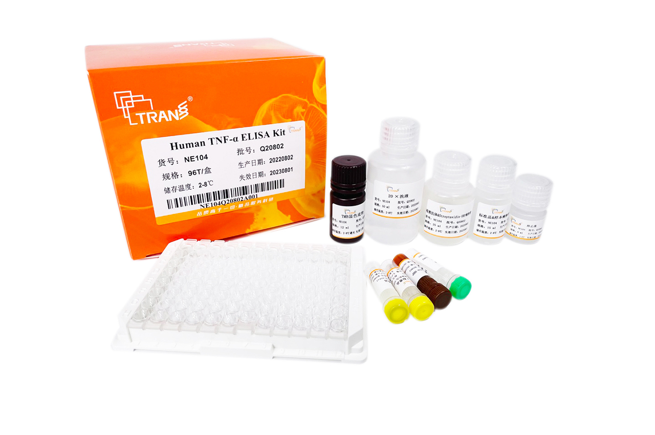 本試劑盒采用雙抗體夾心ELISA法定量測定人血清、血漿和細胞培養(yǎng)上清中的TNF-α含量。本試劑盒采用高親和力的抗人TNF-α抗體預包被酶標板,將標準品/待測樣本加入微板孔中,經(jīng)過孵育后樣本中存在的TNF-α會與酶標板上的預包被抗體特異性結合。洗滌去除未結合物后,將生物素標記的抗人TNF-α檢測抗體加入微板孔中,再次孵育后檢測抗體會與錨定在酶標板上的TNF-α特異性結合。隨后,將辣根過氧化物酶標記的鏈霉親和素(Streptavidin-HRP)加至微孔板中并孵育,通過檢測抗體上的生物素和鏈霉親和素發(fā)生的高強度非共價結合,形成“包被抗體-人TNF-α蛋白-檢測抗體-Streptavidin-HRP”免疫復合物。再次洗滌后,將顯色底物TMB加至微板孔中,HRP會催化TMB底物生成藍色產(chǎn)物,顏色反應的深淺將與樣本中TNF-α的濃度成正相關。而后加入終止液終止反應,在450 nm波長(參考波長570 - 630 nm)處測定吸光度值。通過繪制標準曲線,由樣本吸光度值可計算出樣本中所含TNF-α濃度。本試劑盒特異性強、檢測靈敏度高,同時操作更加便捷。