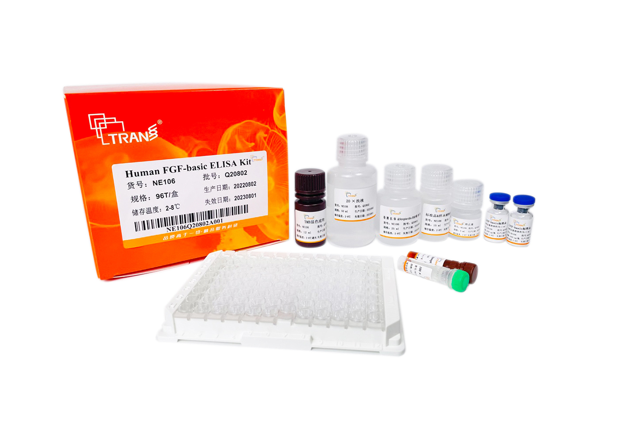 本試劑盒采用雙抗體夾心ELISA法定量測定人血清、血漿和細胞培養(yǎng)上清中的FGF basic含量。本試劑盒采用高親和力的抗人FGF basic抗體預(yù)包被酶標板,將標準品/待測樣本加入微板孔中,經(jīng)過孵育后樣本中存在的FGF basic會與酶標板上的預(yù)包被抗體特異性結(jié)合。洗滌去除未結(jié)合物后,將生物素標記的抗人FGF basic檢測抗體加入微板孔中,再次孵育后檢測抗體會與錨定在酶標板上的FGF basic特異性結(jié)合。隨后,將辣根過氧化物酶標記的鏈霉親和素(Streptavidin-HRP)加至微孔板中并孵育,通過檢測抗體上的生物素和鏈霉親和素發(fā)生的高強度非共價結(jié)合,形成“包被抗體-人FGF basic蛋白-檢測抗體-Streptavidin-HRP”免疫復(fù)合物。再次洗滌后,將顯色底物TMB加至微板孔中,HRP會催化TMB底物生成藍色產(chǎn)物,顏色反應(yīng)的深淺將與樣本中FGF basic的濃度成正相關(guān)。而后加入終止液終止反應(yīng),在450 nm波長(參考波長570 - 630 nm)處測定吸光度值。通過繪制標準曲線,由樣本吸光度值可計算出樣本中所含F(xiàn)GF basic濃度。本試劑盒特異性強、檢測靈敏度高,同時操作更加便捷。