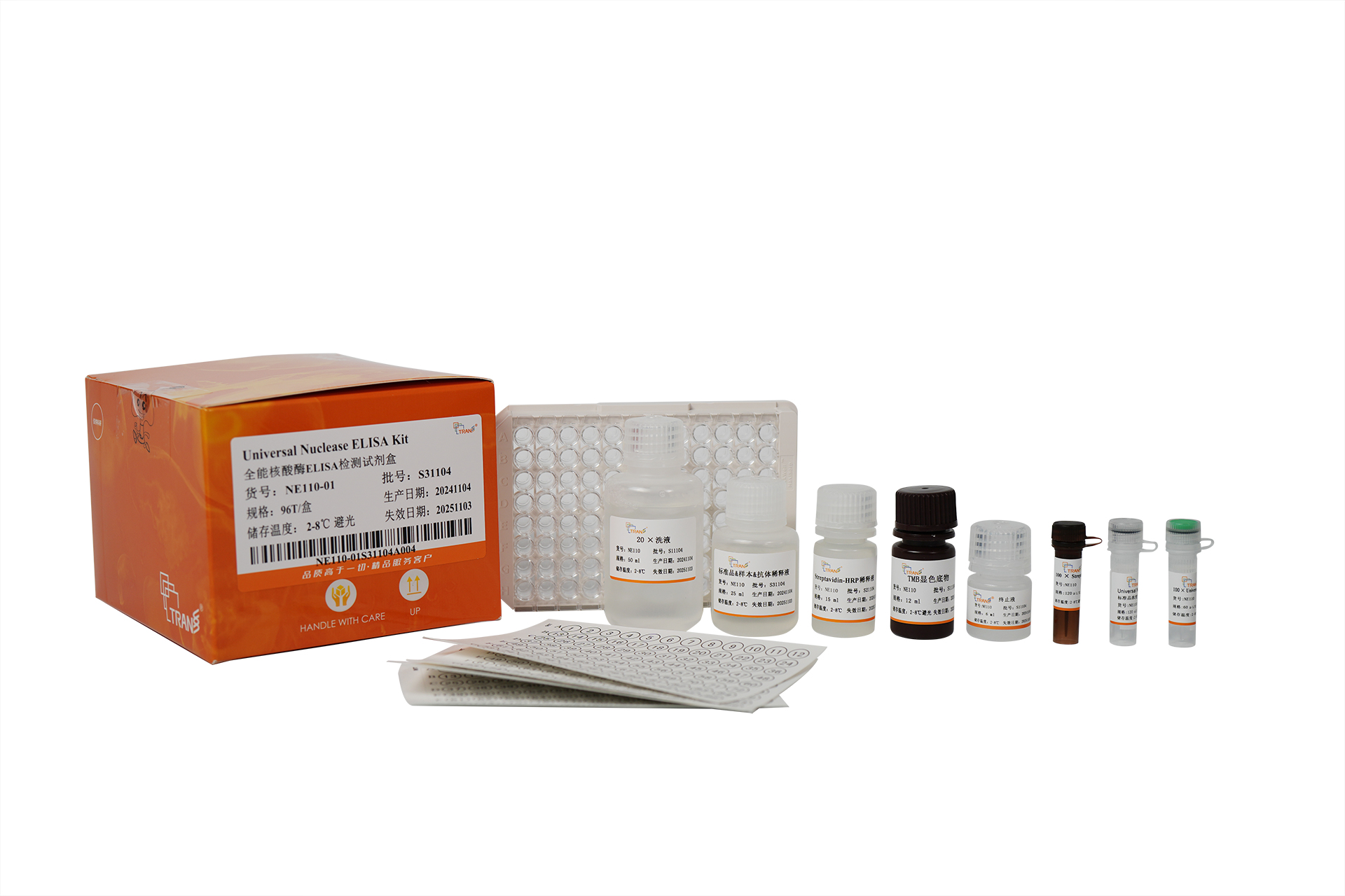 本試劑盒采用雙抗體夾心ELISA法定量測定生物制品中Universal Nuclease的殘留量。本試劑盒采用高親和力的Universal Nuclease抗體預(yù)包被酶標(biāo)板,將標(biāo)準(zhǔn)品/待測樣本和生物素標(biāo)記的抗Universal Nuclease檢測抗體同步加入微板孔中,經(jīng)過孵育后樣本中存在的Universal Nuclease會與酶標(biāo)板上的預(yù)包被抗體及檢測抗體特異性結(jié)合。洗滌去除未結(jié)合物后,將辣根過氧化物酶標(biāo)記的鏈霉親和素(Streptavidin-HRP)加至微孔板中并孵育,通過檢測抗體上的生物素和鏈霉親和素發(fā)生的高強度非共價結(jié)合,形成“包被抗體- Universal Nuclease蛋白-檢測抗體-Streptavidin-HRP”免疫復(fù)合物。再次洗滌后,將顯色底物TMB加至微板孔中,HRP會催化TMB底物生成藍(lán)色產(chǎn)物,顏色反應(yīng)的深淺將與樣本中Universal Nuclease的濃度成正相關(guān)。而后加入終止液終止反應(yīng),在450 nm波長(參考波長570 - 630 nm)處測定吸光度值。通過繪制標(biāo)準(zhǔn)曲線,由樣本吸光度值可計算出樣本中所含Universal Nuclease濃度。本試劑盒特異性強、檢測靈敏度高,同時操作更加便捷。