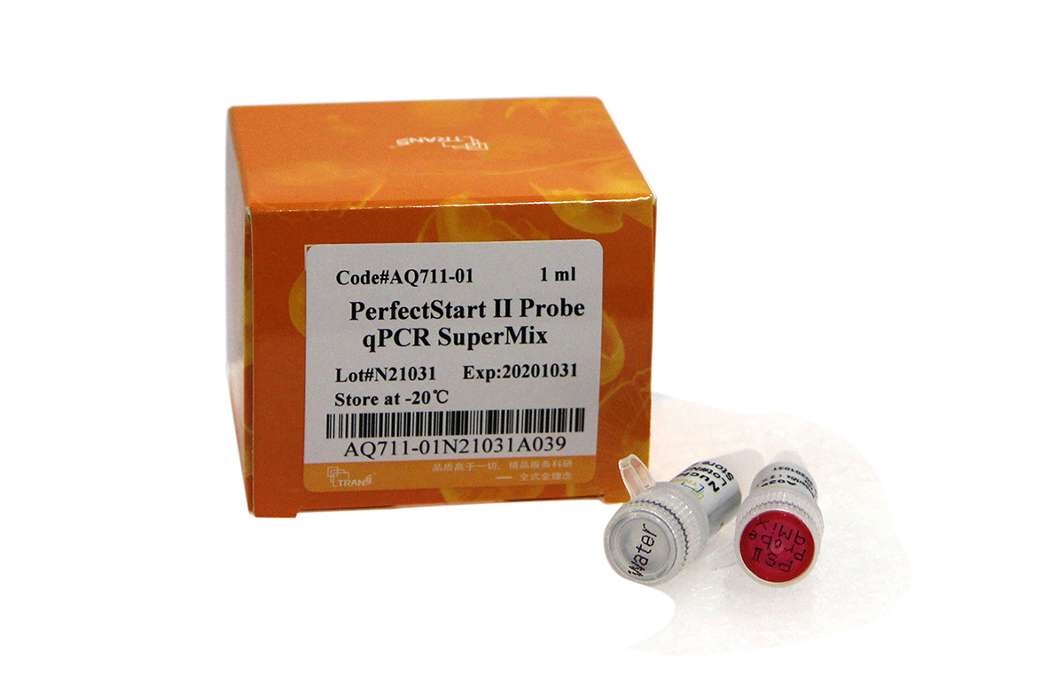 PerfectStart? II Probe qPCR SuperMix利用在PCR體系中加入熒光探針 (TaqMan或Molecular Beacon等),擴(kuò)增過程中其 熒光量與擴(kuò)增產(chǎn)物量成正比,通過熒光量的檢測測定樣本核酸量。本產(chǎn)品含PerfectStartTM Taq熱啟動(dòng)酶 (利用3種單克 隆抗體與Taq DNA Polymerase高效結(jié)合,有效地封閉了DNA聚合酶活性,阻止了低溫下的非特異性擴(kuò)增)、特殊優(yōu)化的qPCR反應(yīng)緩沖液、dNTPs、PCR增強(qiáng)劑、穩(wěn)定劑。本產(chǎn)品濃度為2×,使用時(shí)只需加入模板、引物、探針、Passive Reference Dye (根據(jù)qPCR儀選擇) 和水,使其工作濃度為1×,即可進(jìn)行反應(yīng)。