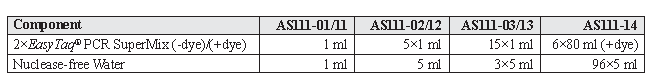 2×EasyTaq? PCR SuperMix (-dye)包含EasyTaq? DNA Polymerase、dNTPs和優(yōu)化的反應(yīng)緩沖液,濃度為2×。DNA擴(kuò)增時(shí),只需加入模板、引物和水,使SuperMix溶液的濃度為1×即可進(jìn)行反應(yīng)。擴(kuò)增產(chǎn)物3' 端帶“A”堿基,2×EasyTaq? PCR SuperMix (-dye) 擴(kuò)增產(chǎn)物可直接克隆于pEASY?-T系列載體中;2×EasyTaq? PCR SuperMix (+dye) 擴(kuò)增產(chǎn)物可直接點(diǎn)樣電泳,如用于克隆,需純化去掉染料。其PCR產(chǎn)物不適用于聚丙烯酰胺凝膠電泳。